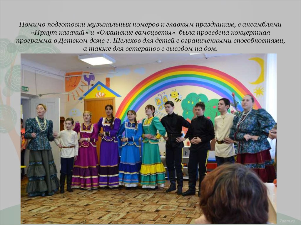 5. Помимо подготовки музыкальных номеров к главным праздникам, с ансамблями «Иркут казачий» и «Олхинские самоцветы» была проведена концертн