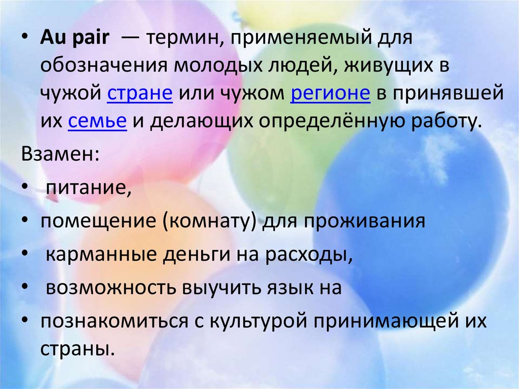 • Au pair — термин, применяемый дляобозначения молодых людей, живущих в