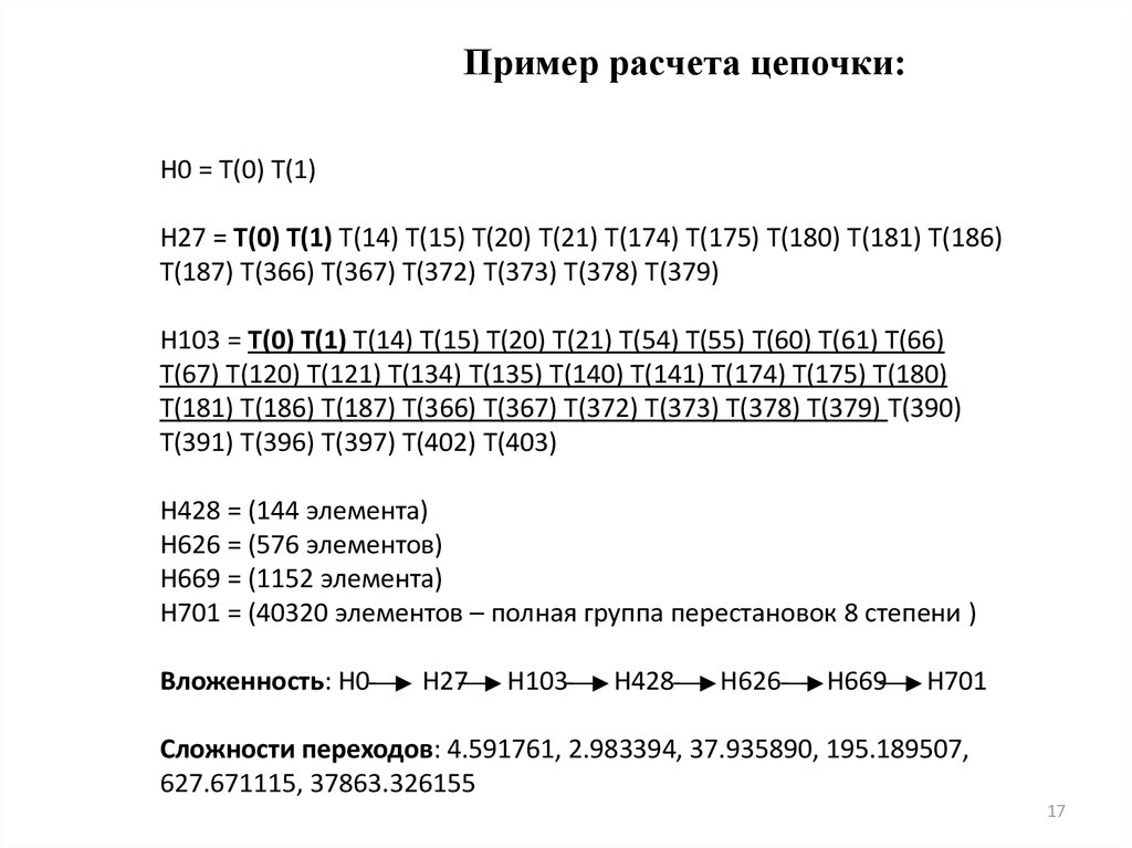 2) Посчитаны цепочки вложенных групп перестановок на четырёх –, шести и восьмивершинном графе.