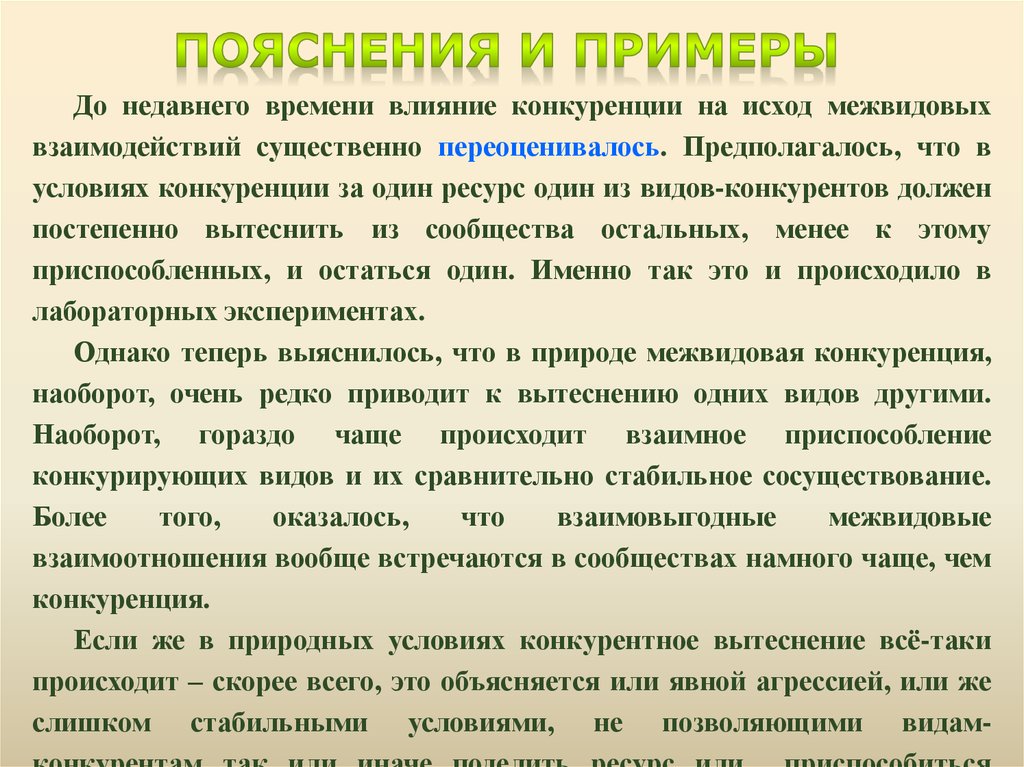 До недавнего времени влияние конкуренции на исход межвидовыхвзаимодействий существенно переоценивалось. Предполагалось, что в