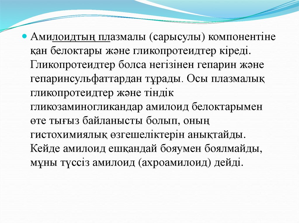 Амилоидтың плазмалы (сарысулы) компонентінеқан белоктары және гликопротеидтер кіреді.