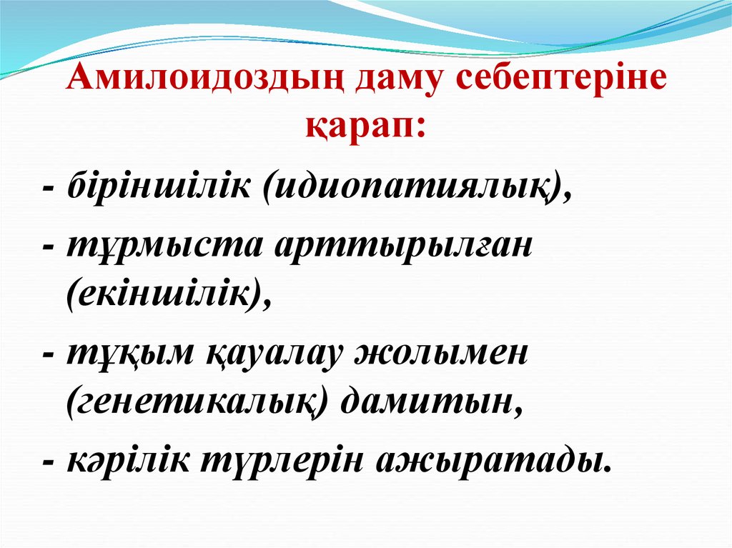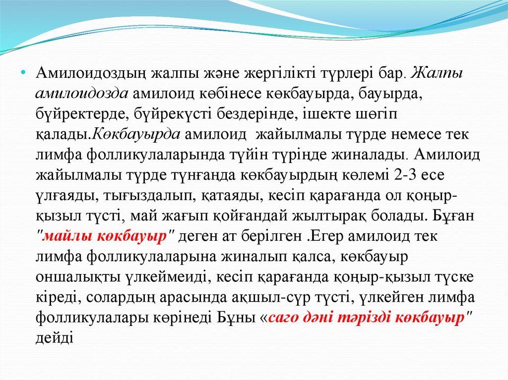 • Амилоидоздың жалпы және жергілікті түрлері бар. Жалпыамилоидозда амилоид көбінесе көкбауырда, бауырда,