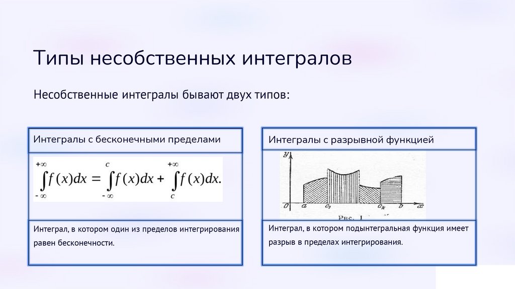 Типы несобственных интеграловНесобственные интегралы бывают двух типов: