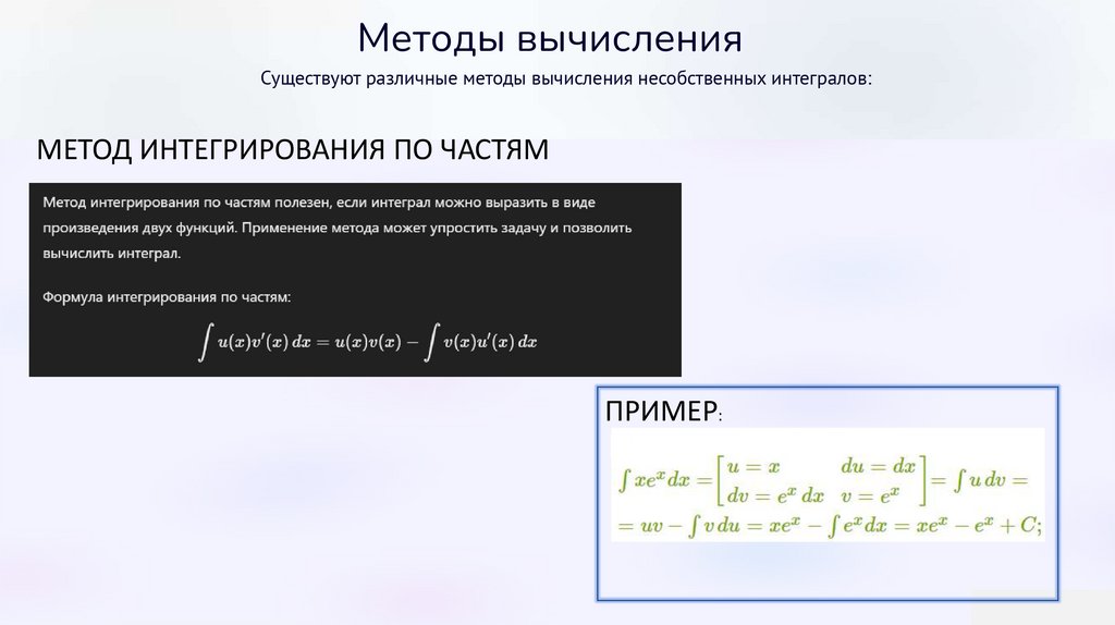 Методы вычисленияСуществуют различные методы вычисления несобственных интегралов: