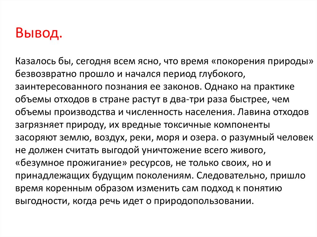 Вывод.Казалось бы, сегодня всем ясно, что время «покорения природы»