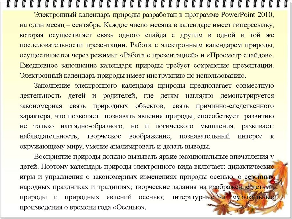 Электронный календарь природы разработан в программе PowerPoint 2010,на один месяц – сентябрь. Каждое число месяца в календаре имеет гиперссылку,