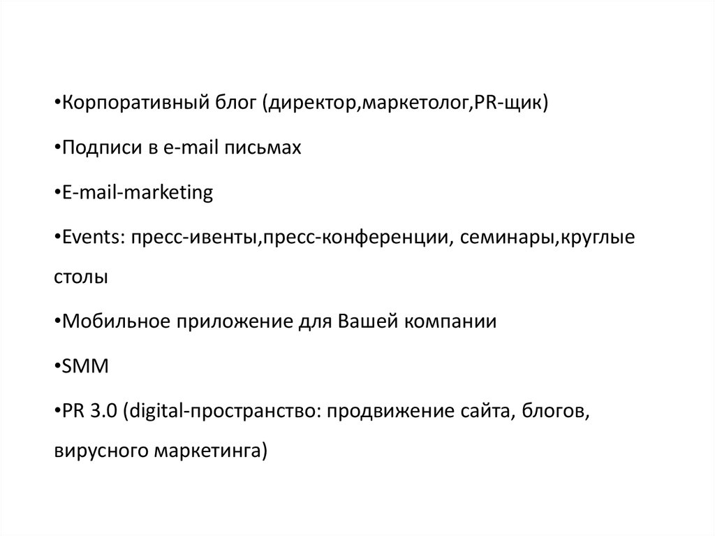 •Корпоративный блог (директор,маркетолог,PR-щик)•Подписи в e-mail письмах