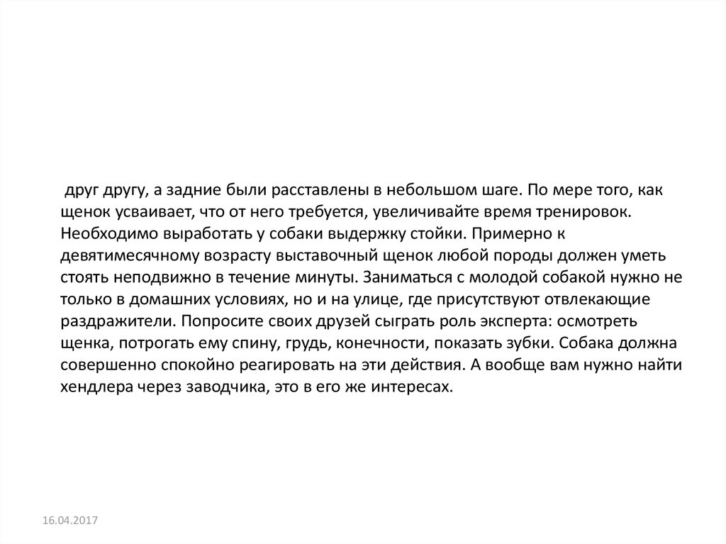 размеренно и ритмично; Чтобы приучить щенка к стойке, достаточно