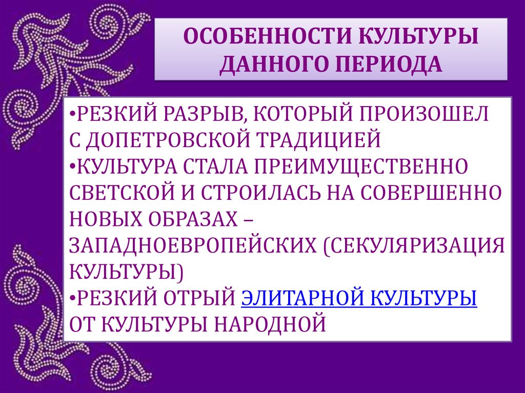 ОСОБЕННОСТИ КУЛЬТУРЫДАННОГО ПЕРИОДА