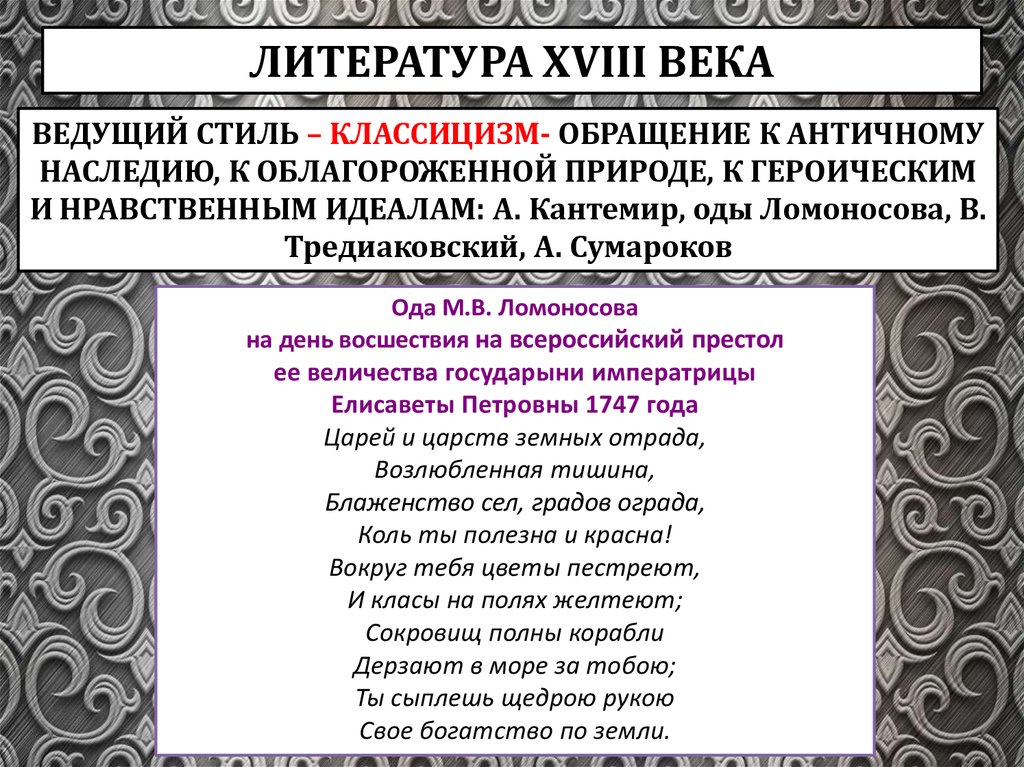 ЛИТЕРАТУРА ХVIII ВЕКАВЕДУЩИЙ СТИЛЬ – КЛАССИЦИЗМ- ОБРАЩЕНИЕ К АНТИЧНОМУ