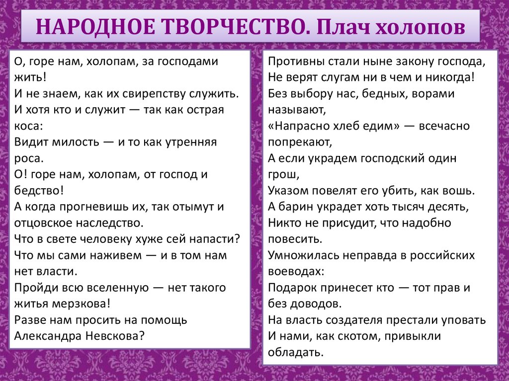 НАРОДНОЕ ТВОРЧЕСТВО. Плач холоповО, горе нам, холопам, за господами
