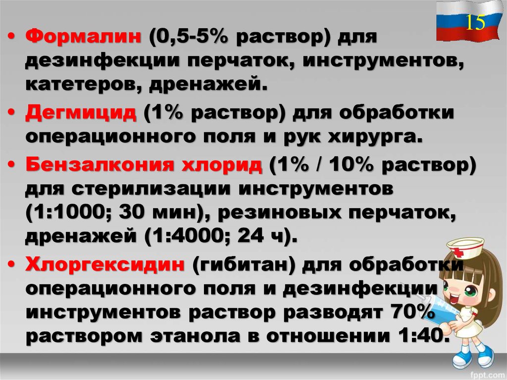 хлоргексидина разводят соответственно в 400 и 1000 мл дистиллированной воды. Выраженным антибактериальным