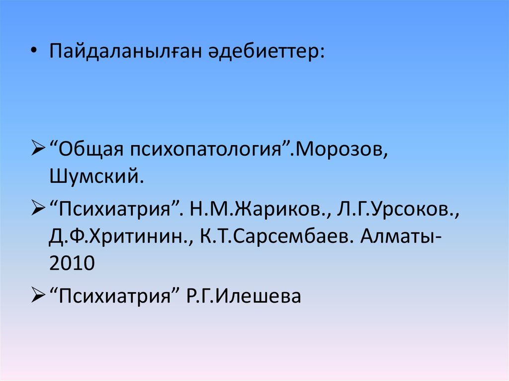 • Пайдаланылған әдебиеттер:“Общая психопатология”.Морозов,