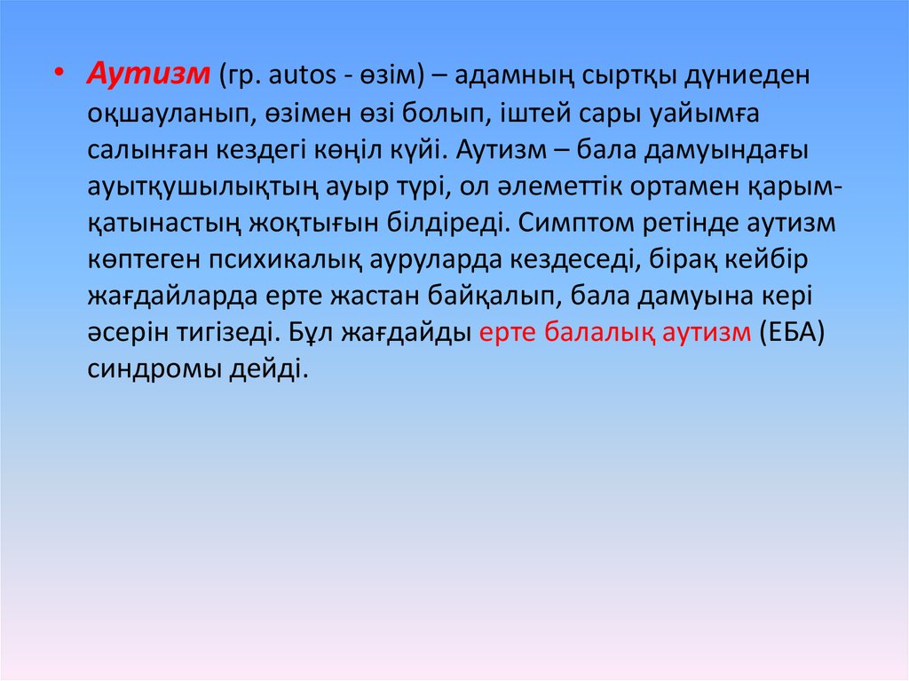 • Аутизм (гр. аutos - өзім) – адамның сыртқы дүниеденоқшауланып, өзімен өзі болып, іштей сары уайымға