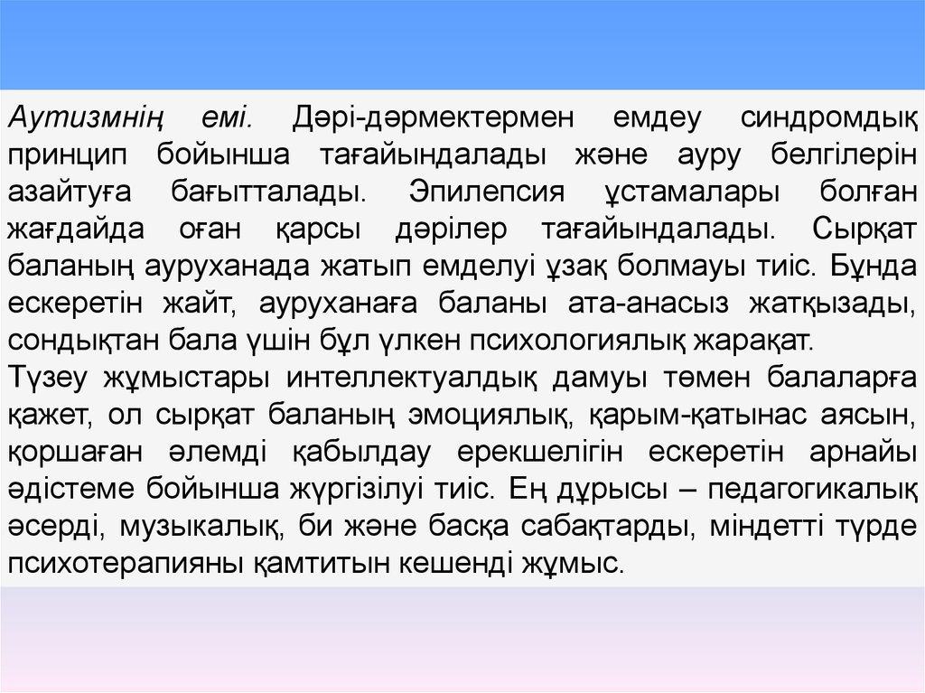 Аутизмнің емі. Дәрі-дәрмектермен емдеу синдромдықпринцип бойынша тағайындалады және ауру белгілерін