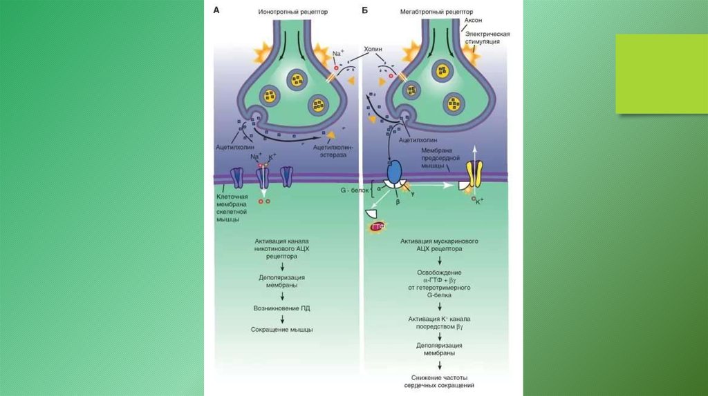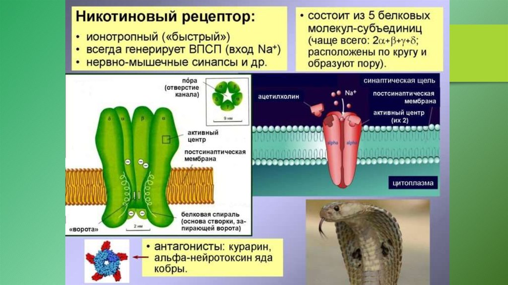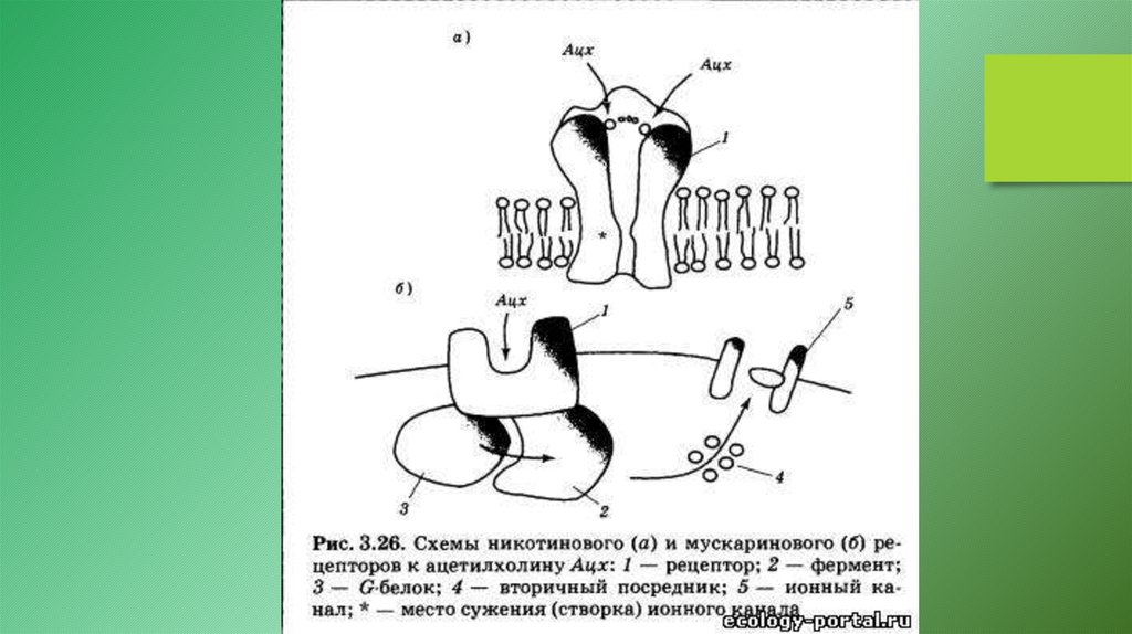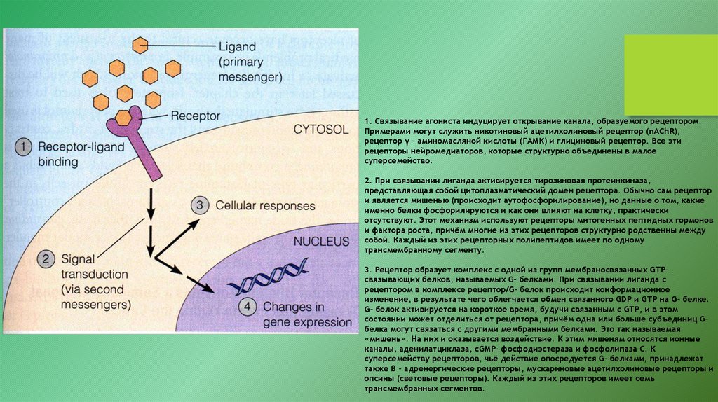 1. Связывание агониста индуцирует открывание канала, образуемого рецептором.Примерами могут служить никотиновый ацетилхолиновый рецептор (nAChR),
