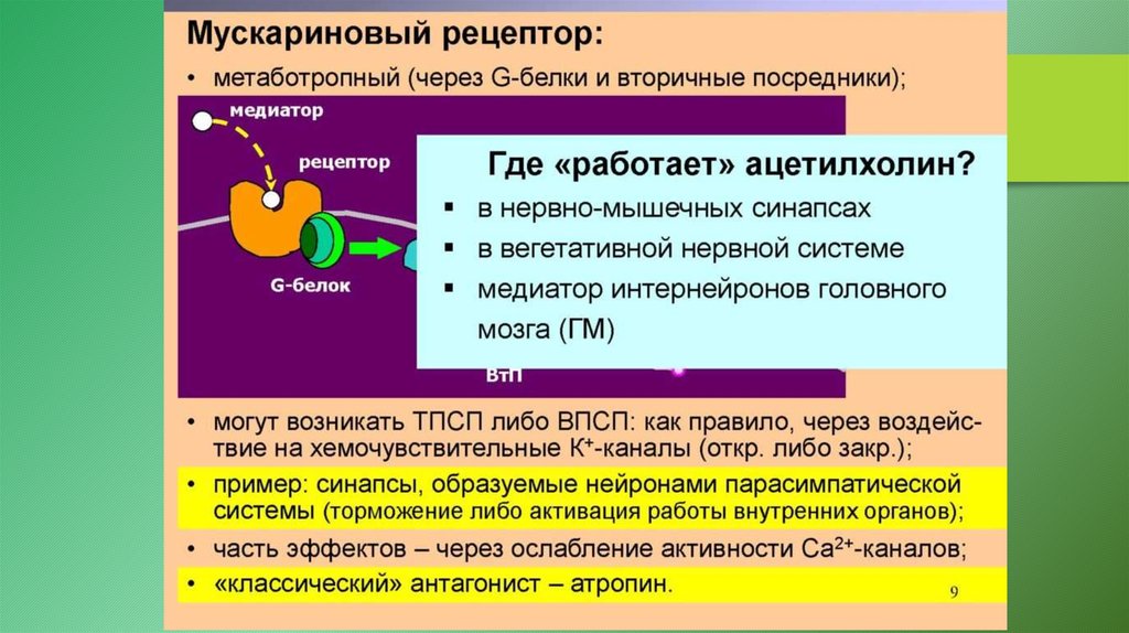 также β – адренергические рецепторы, мускариновые ацетилхолиновые рецепторы и