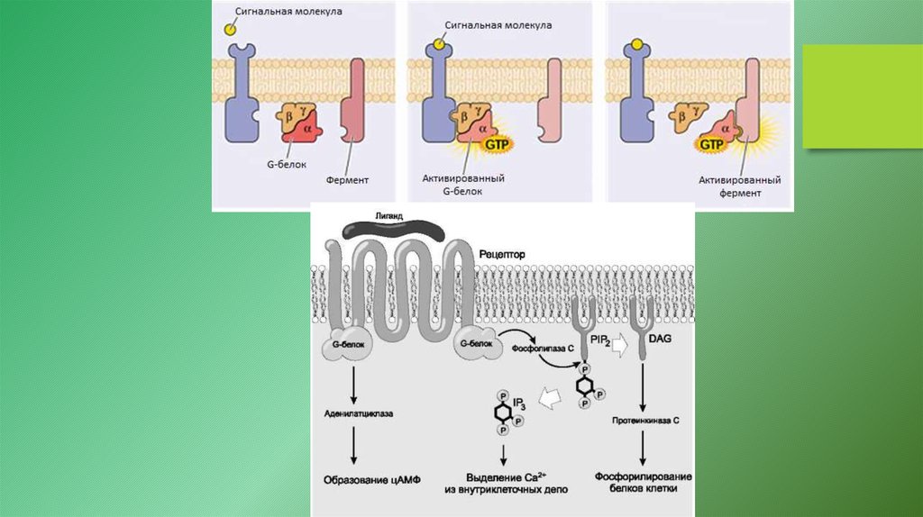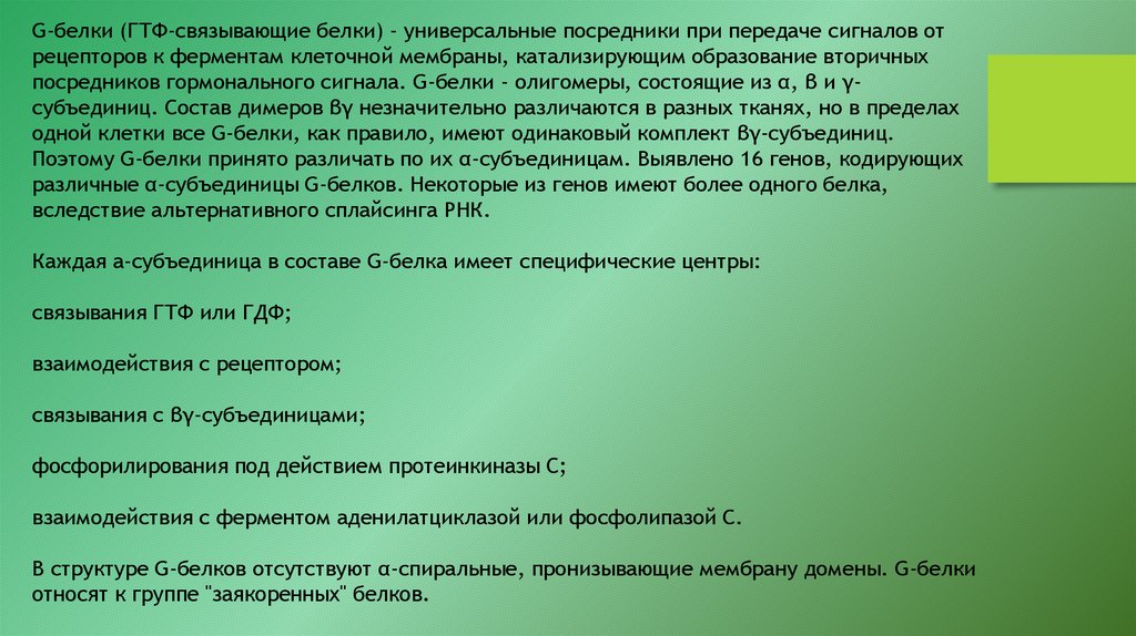 G-белки (ГТФ-связывающие белки) - универсальные посредники при передаче сигналов отрецепторов к ферментам клеточной мембраны, катализирующим образование вторичных