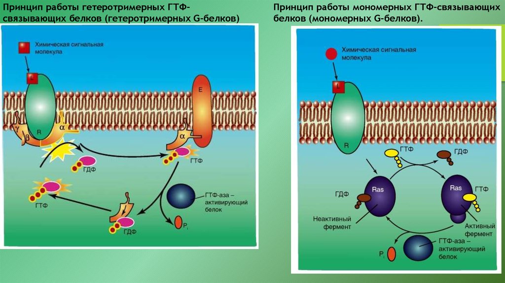 Принцип работы гетеротримерных ГТФсвязывающих белков (гетеротримерных G-белков)Принцип работы мономерных ГТФ-связывающих