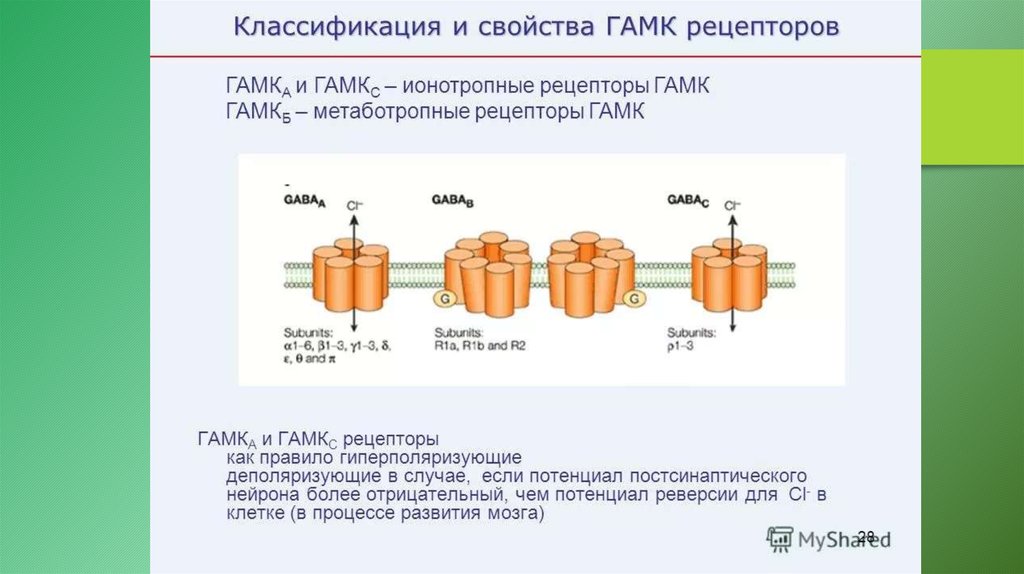 рецептор γ – аминомасляной кислоты (ГАМК) и глициновый рецептор. Все эти