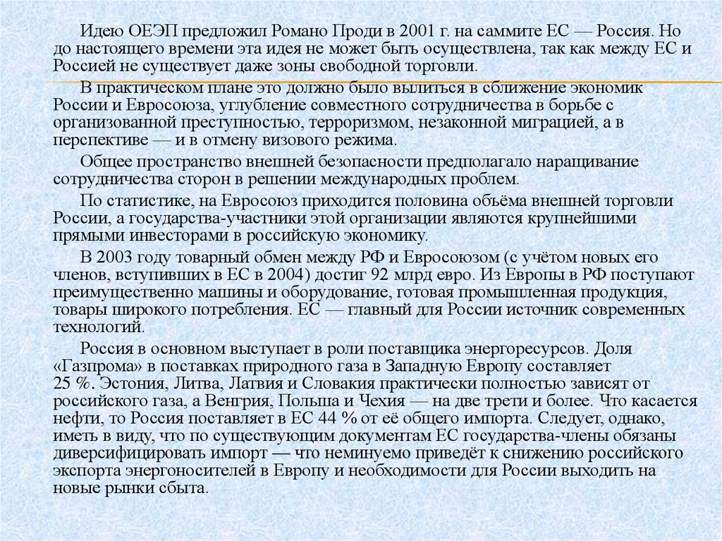Идею ОЕЭП предложил Романо Проди в 2001 г. на саммите ЕС — Россия. Нодо настоящего времени эта идея не может быть осуществлена, так как между ЕС и