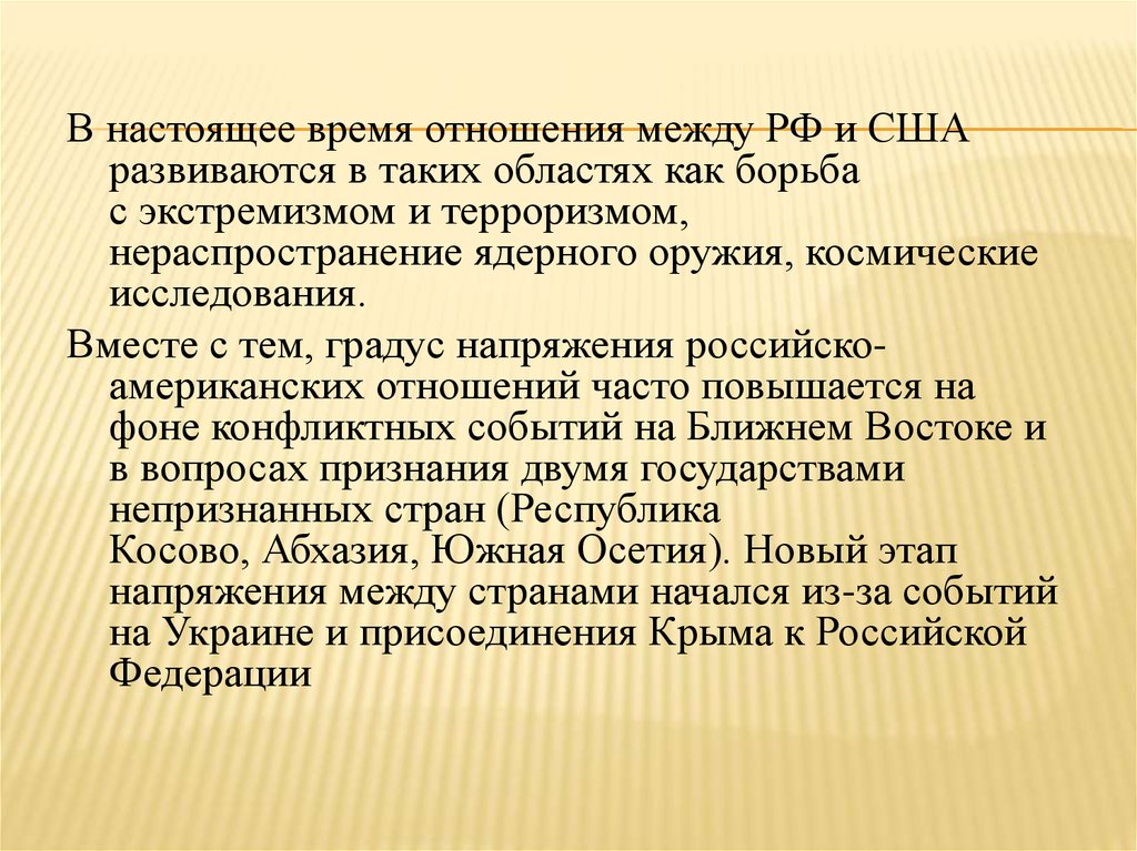 В настоящее время отношения между РФ и США развиваются в таких областях