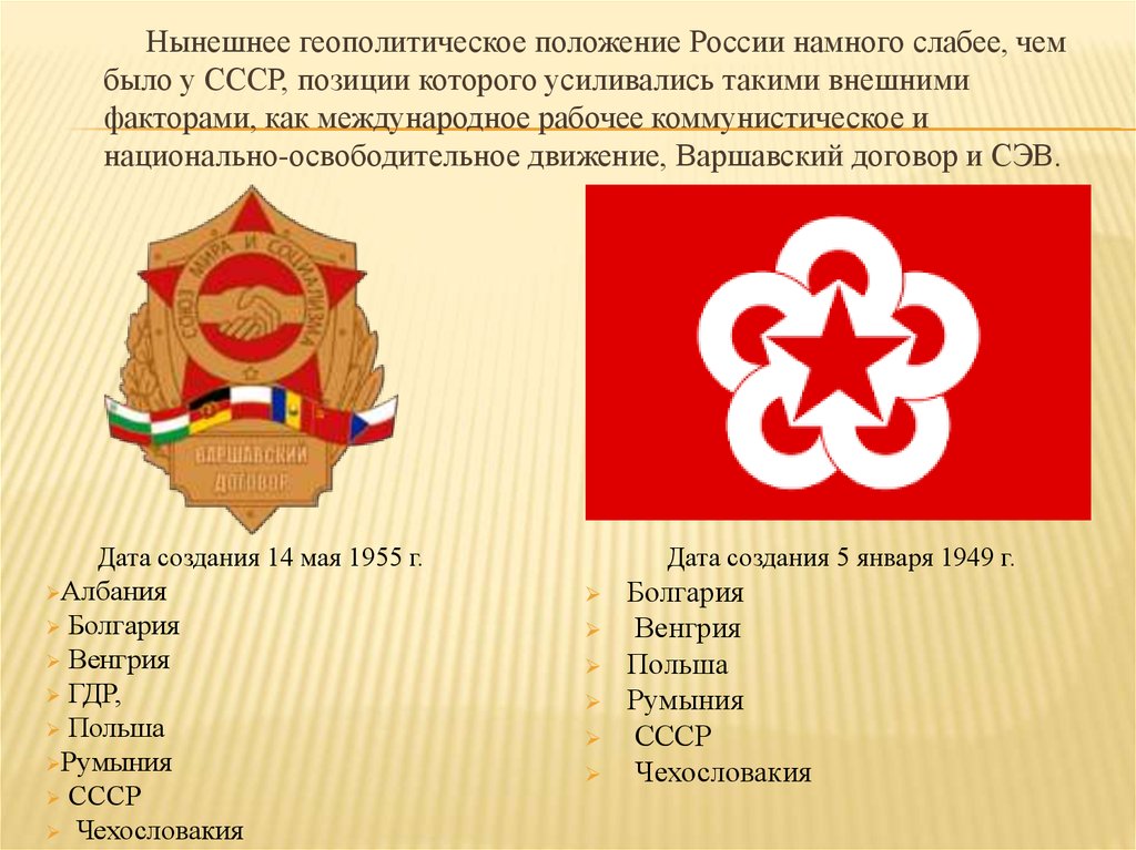 Нынешнее геополитическое положение России намного слабее, чембыло у СССР, позиции которого усиливались такими внешними