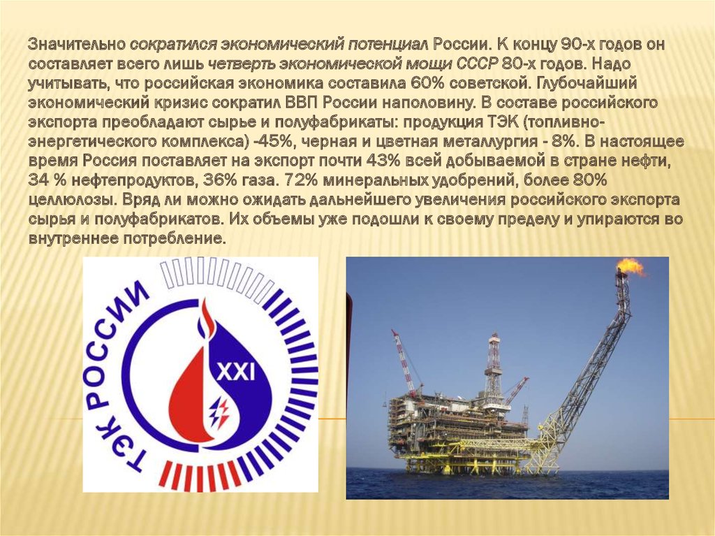 Значительно сократился экономический потенциал России. К концу 90-х годов онсоставляет всего лишь четверть экономической мощи СССР 80-х годов. Надо