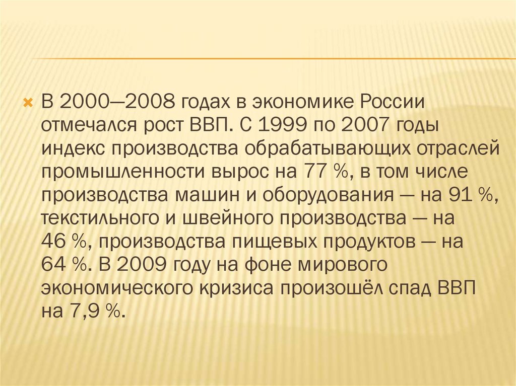 В 2000—2008 годах в экономике Россииотмечался рост ВВП. С 1999 по 2007 годы
