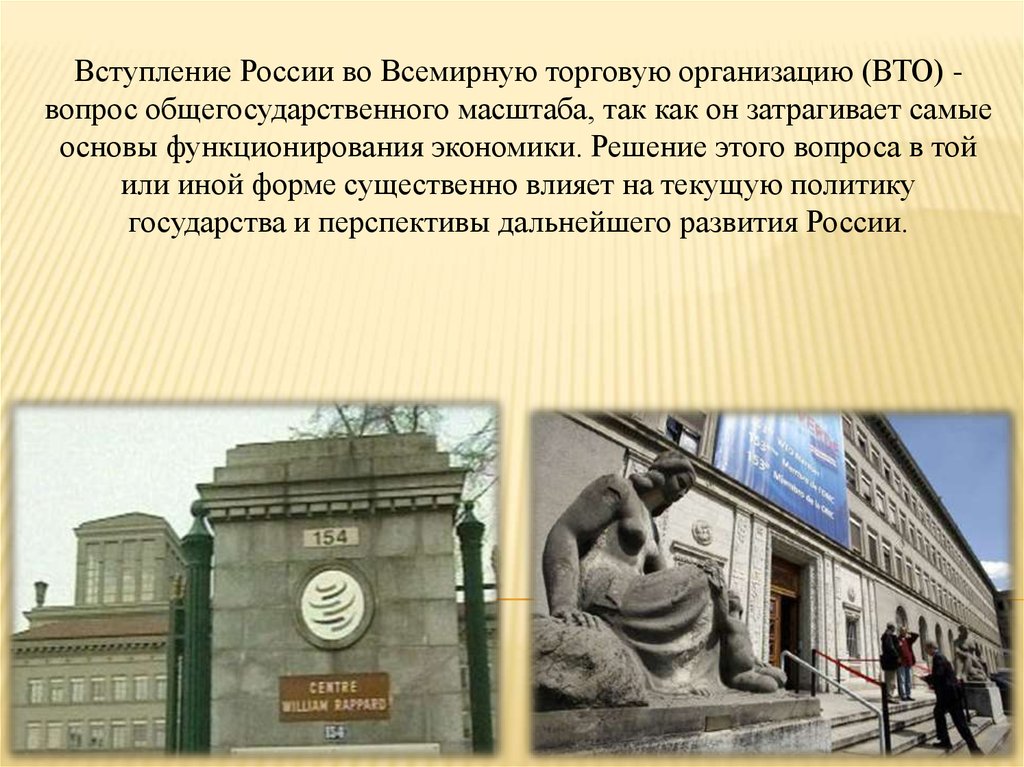 Вступление России во Всемирную торговую организацию (ВТО) вопрос общегосударственного масштаба, так как он затрагивает самыеосновы функционирования экономики. Решение этого вопроса в той