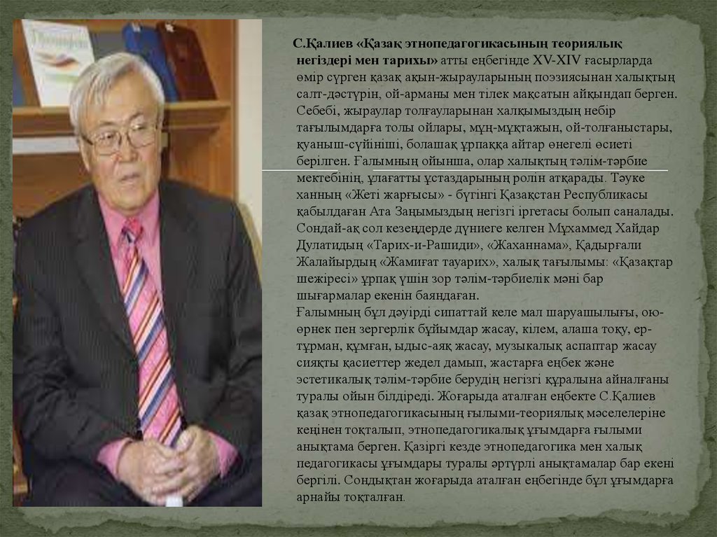 Қазақ этнопедагогикасының теориясын жасау ( С. Қалиев), ғұламалардың