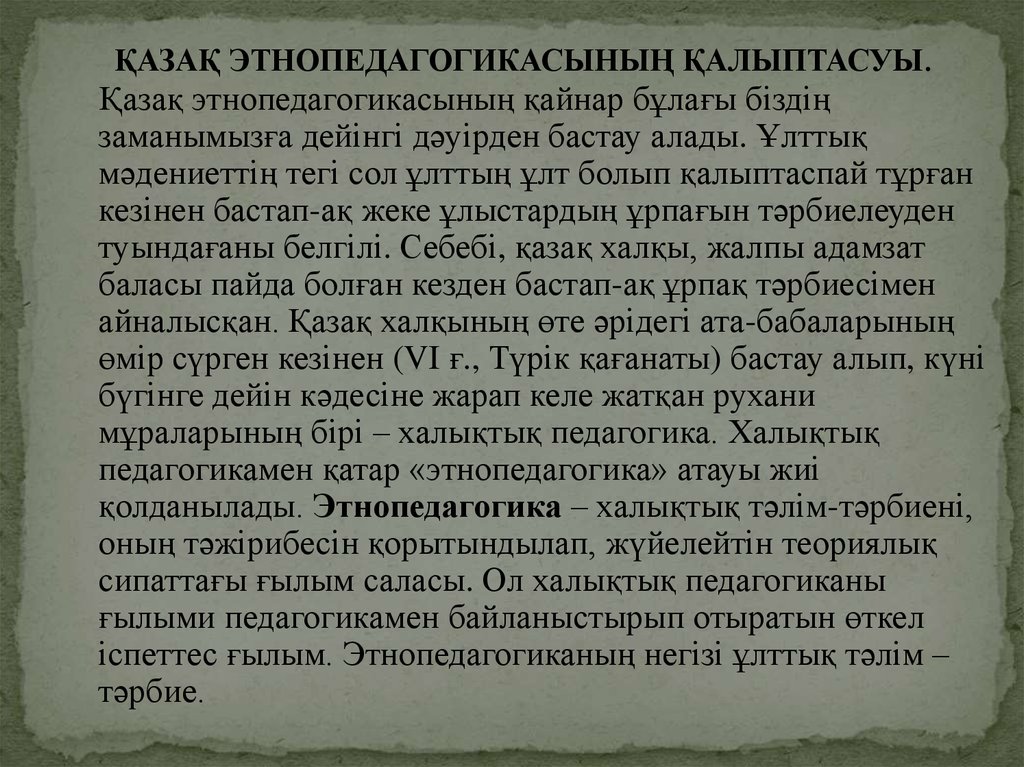 ҚАЗАҚ ЭТНОПЕДАГОГИКАСЫНЫҢ ҚАЛЫПТАСУЫ.Қазақ этнопедагогикасының қайнар бұлағы біздің