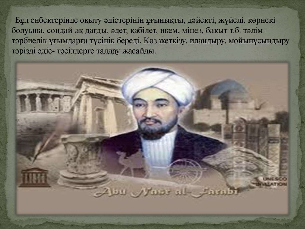 жолға сарп етіп, артында қыруар еңбек жазып қалдырған әл- Фараби бабамыздың тәлімдікұстаздық еңбегі ұшан теңіз. Оның сан- салалы трактаттарында («Мемлекет қайраткерлерінің