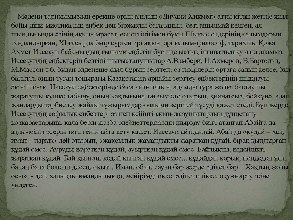 азды-кӛпті әсерін тигізгенін айта кету қажет. Иассауи айтқандай, Абай да «құдай – хақ,