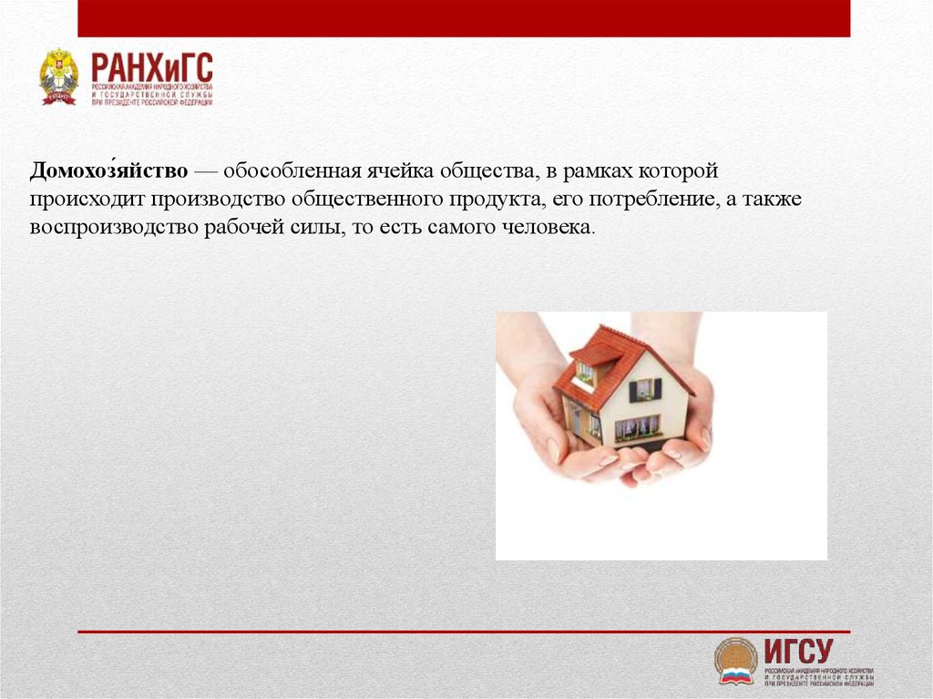 Домохоз́яйство — обособленная ячейка общества, в рамках которойпроисходит производство общественного продукта, его потребление, а также