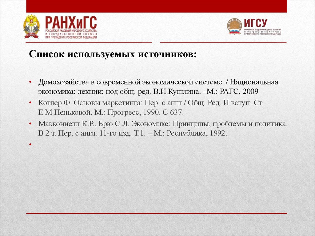 Список используемых источников:• Домохозяйства в современной экономической системе. / Национальная