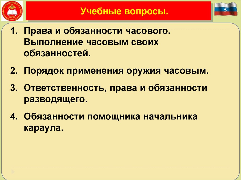 Учебные вопросы.1. Права и обязанности часового.