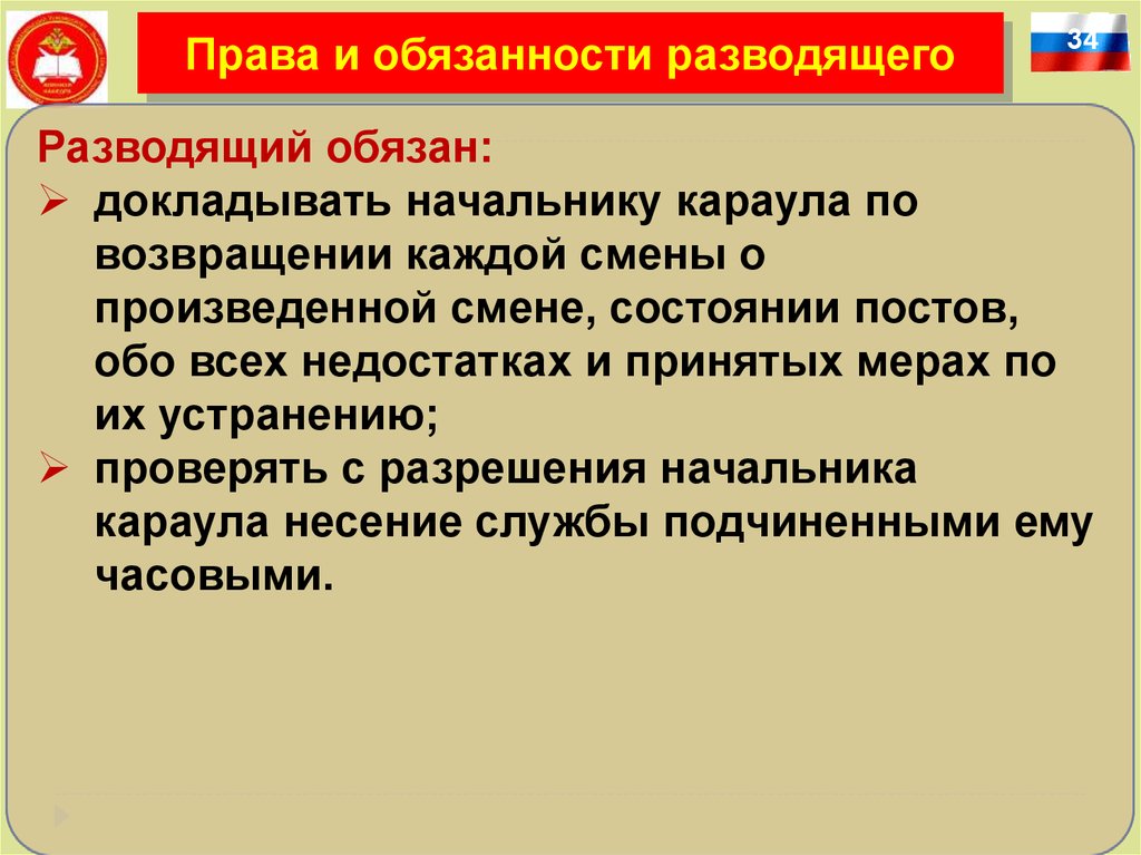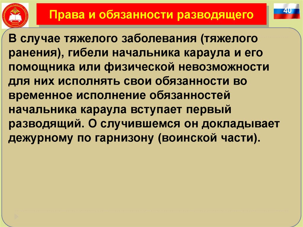 Права и обязанности разводящегоВ случае тяжелого заболевания (тяжелого