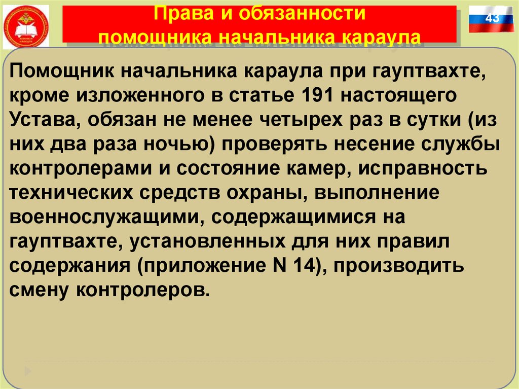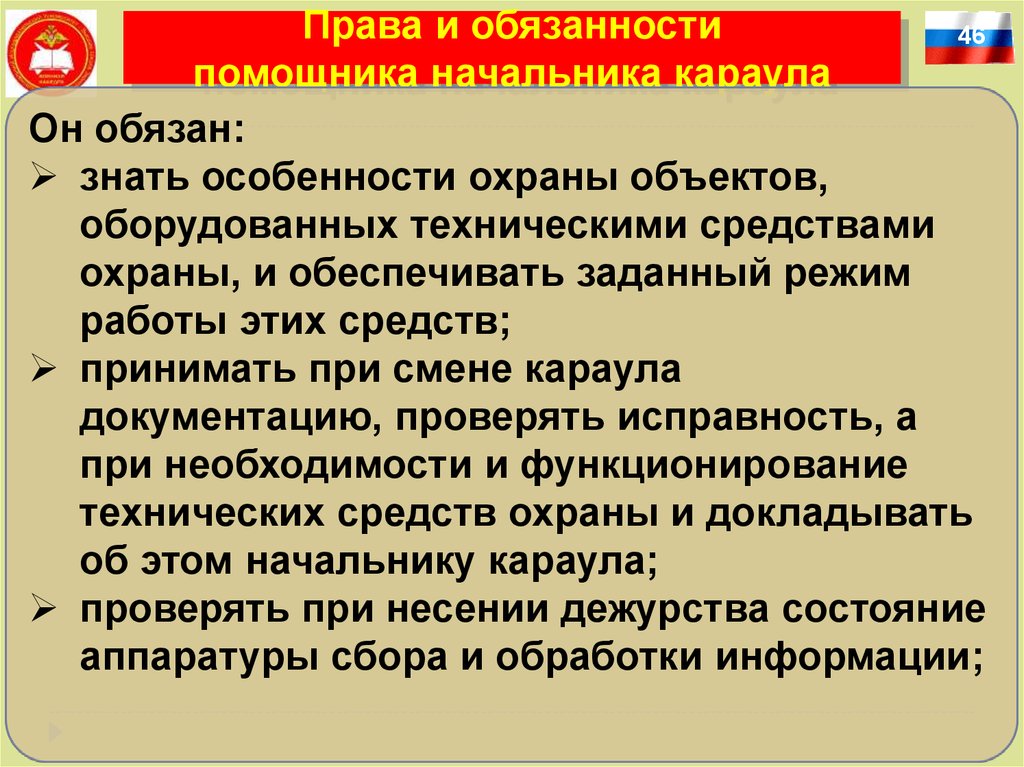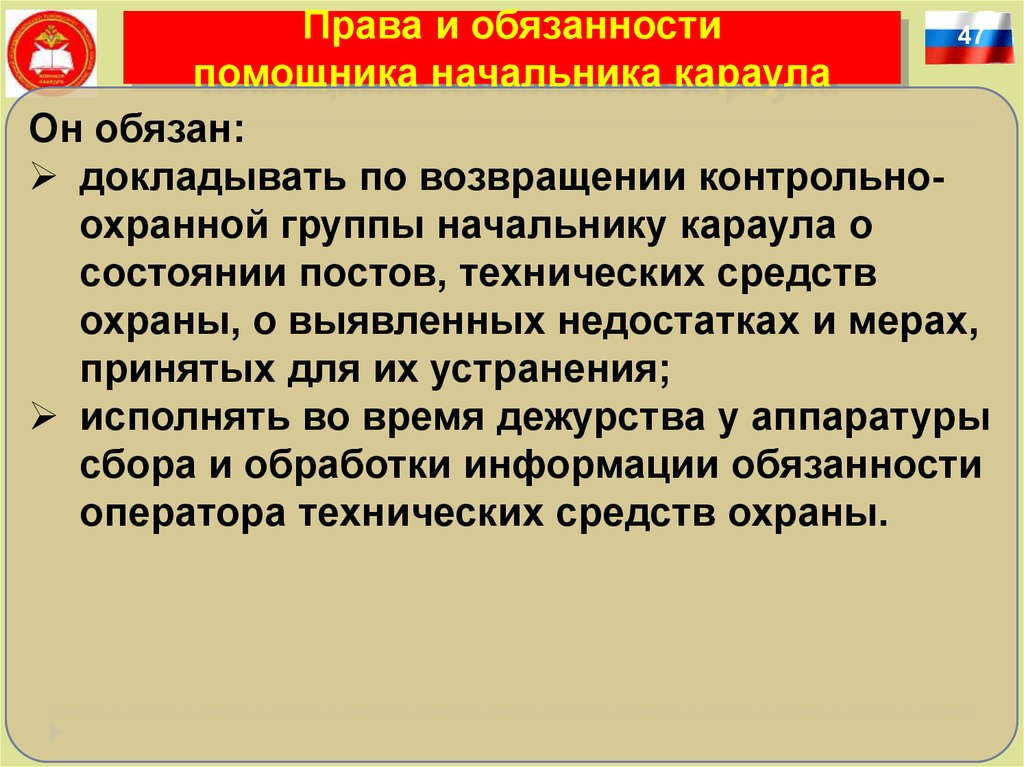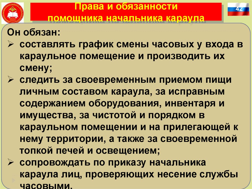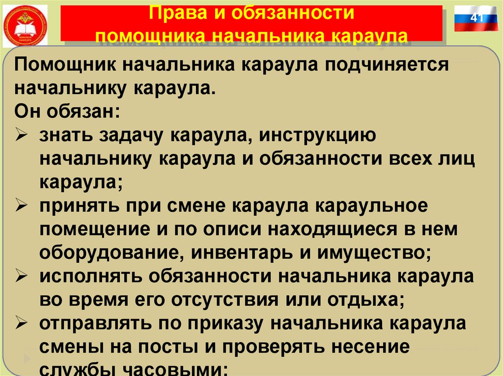 Права и обязанностипомощника начальника караула