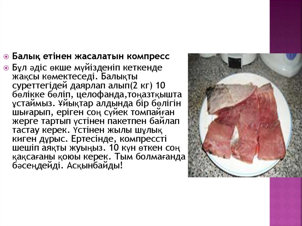 Балық етінен жасалатын компрессБұл әдіс өкше мүйізденіп кеткенде