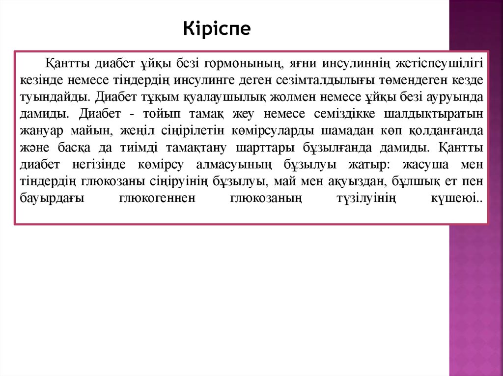 КіріспеҚантты диабет ұйқы безі гормонының, яғни инсулиннің жетіспеушілігі
