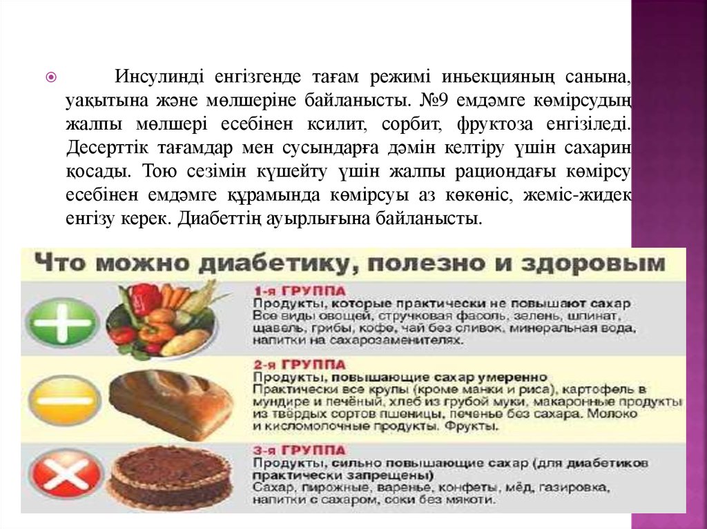 Инсулинді енгізгенде тағам режимі иньекцияның санына,уақытына және мөлшеріне байланысты. №9 емдәмге көмірсудың