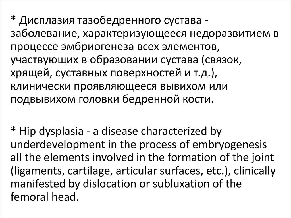 * Дисплазия тазобедренного сустава заболевание, характеризующееся недоразвитием впроцессе эмбриогенеза всех элементов,