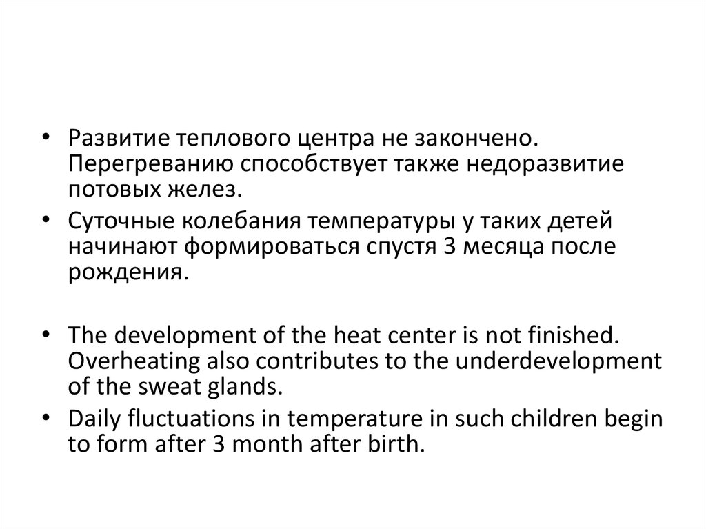 • Развитие теплового центра не закончено.Перегреванию способствует также недоразвитие