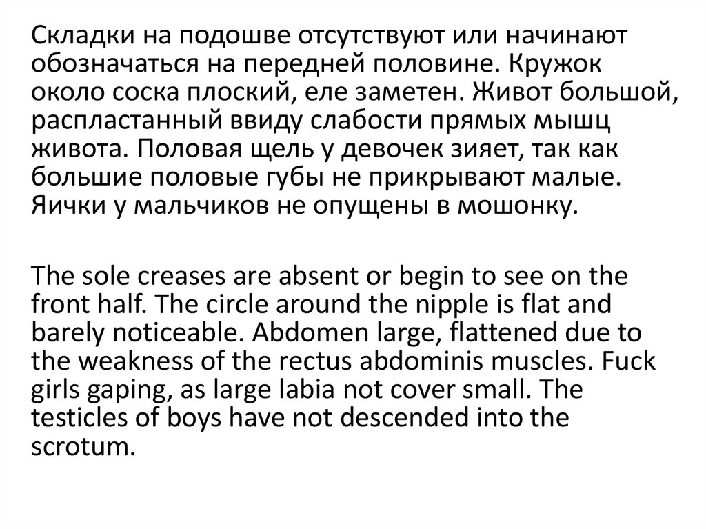 недоношенного 1/3 длины тела. Окружность головки на 34 см больше окружности грудной клетки. Ушные