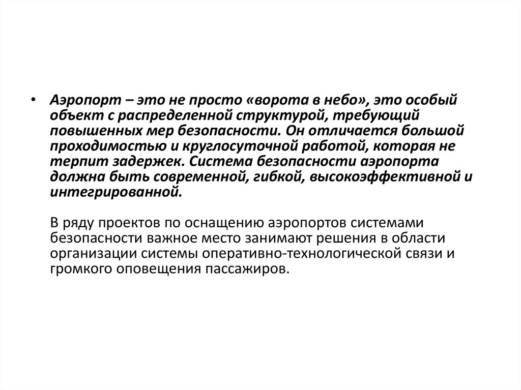 • Аэропорт – это не просто «ворота в небо», это особыйобъект с распределенной структурой, требующий