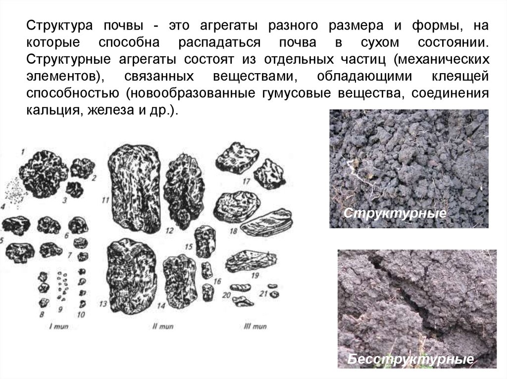 Структура почвы - это агрегаты разного размера и формы, накоторые способна распадаться почва в сухом состоянии.