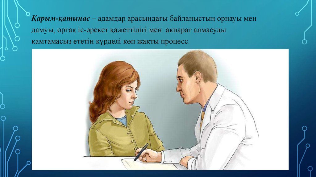 Қарым-қатынас – адамдар арасындағы байланыстың орнауы мендамуы, ортақ іс-әрекет қажеттілігі мен акпарат алмасуды