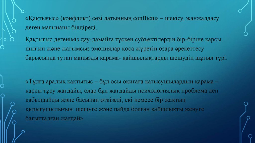 «Қақтығыс» (конфликт) сөзі латынның conflictus – шекісу, жанжалдасудеген мағынаны білдіреді.