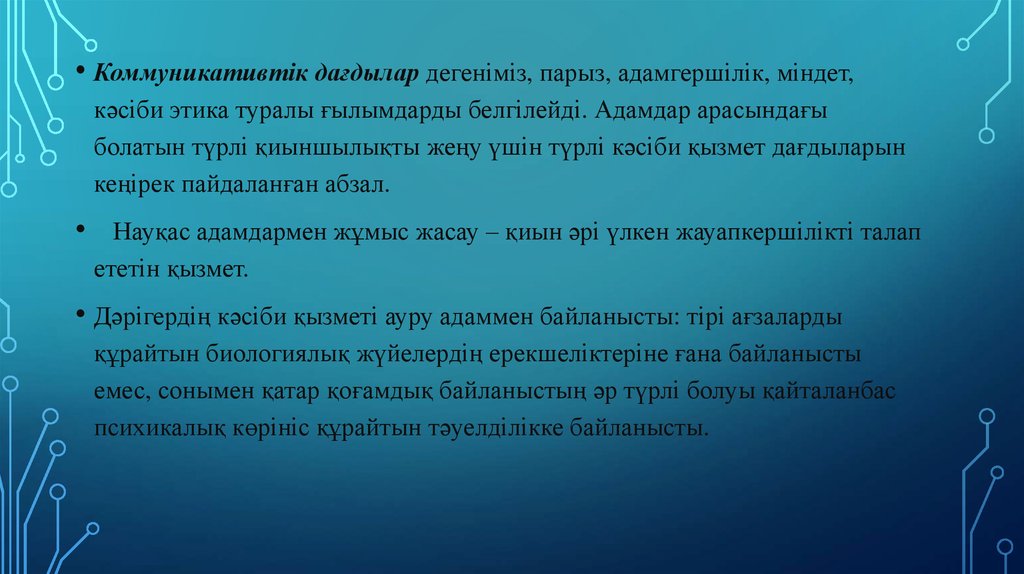 • Дәрігердің кәсіби қызметі ауру адаммен байланысты: тірі ағзаларды